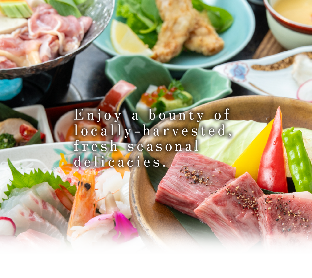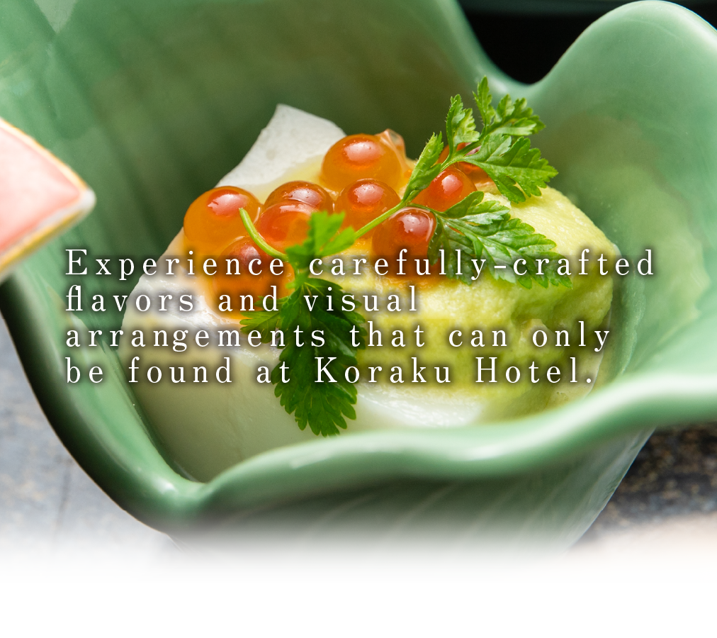 Enjoy bountiful blessings from the seas, the mountains and the villages with locally-harvested, fresh seasonal delicacies.Experience carefully-crafted flavors and visual arrangements that can only be found at Koraku Hotel.