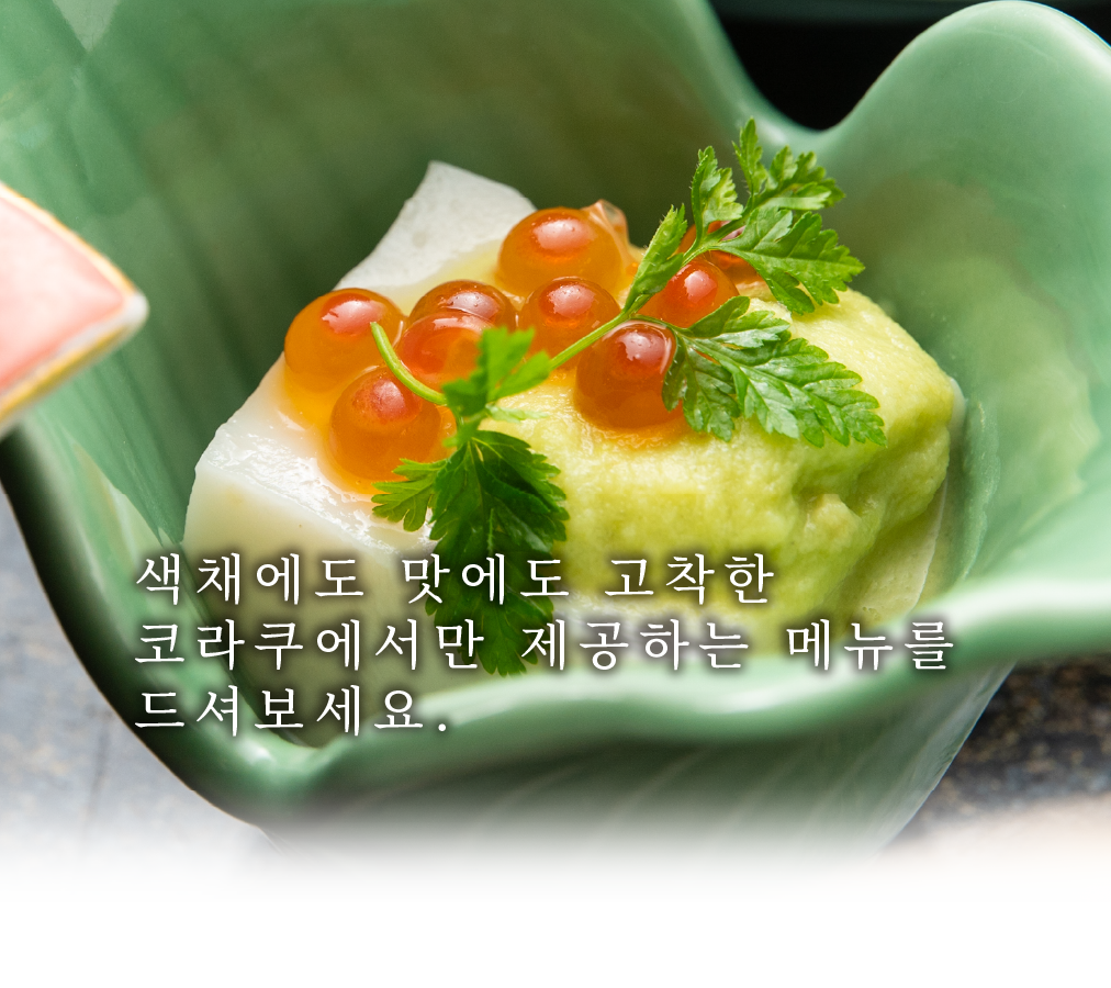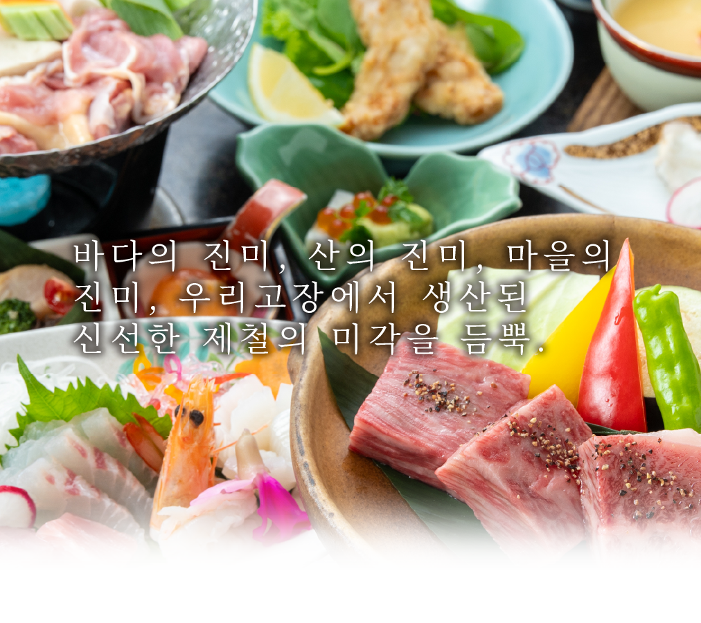 바다의 진미, 산의 진미, 마을의 진미, 우리고장에서 생산된 신선한 제철의 미각을 듬뿍. 색채에도 맛에도 고착한 코라쿠에서만 제공하는 메뉴를 드셔보세요.